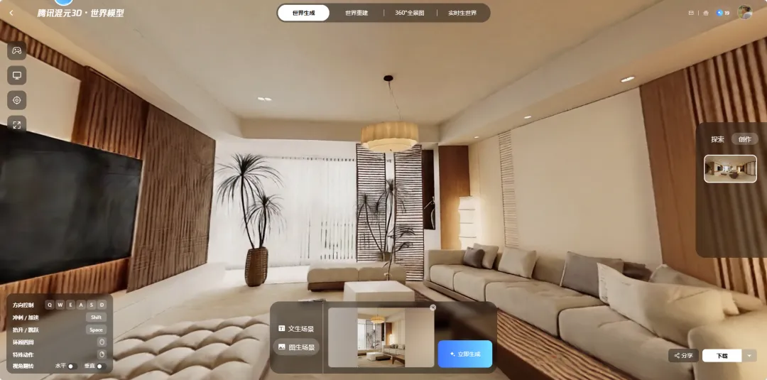 一张客厅图,AI自己补出了半个户型的3d场景?混元3DHY-World 2.0图生场景实测