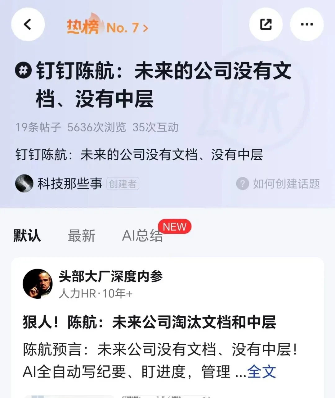 如果陈航所言能够成真,那将是几家欢喜几家愁。正在中层岗位上的人会瑟瑟发抖;已厌倦文山会海的打工人,不用再写文档?简直不要太爽,睡着都能笑醒。