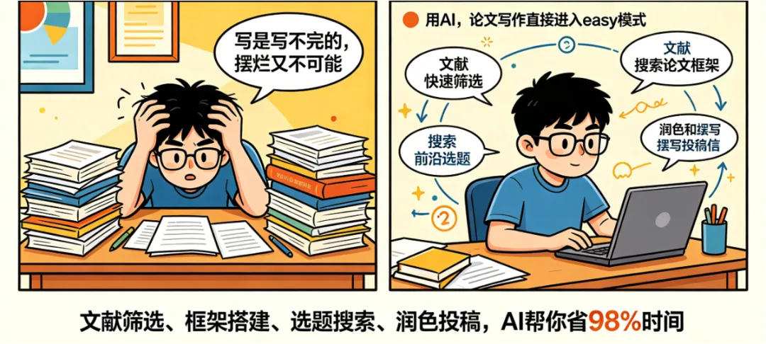 其实,只要你能用好AI工具,真的可以让论文及各种学术写作,直接进入easy模式。平时需要花费大量时间筛选和理解文献内容,看的时候是马冬梅,回忆的时候是什么冬梅,真就完全受限于个人阅读速度。不过有了AI的帮助,无论是文献快速筛选、搭建论文框架、搜索前沿选题,还是后期润色和撰写投稿信,这下都可节省98%的时间了。