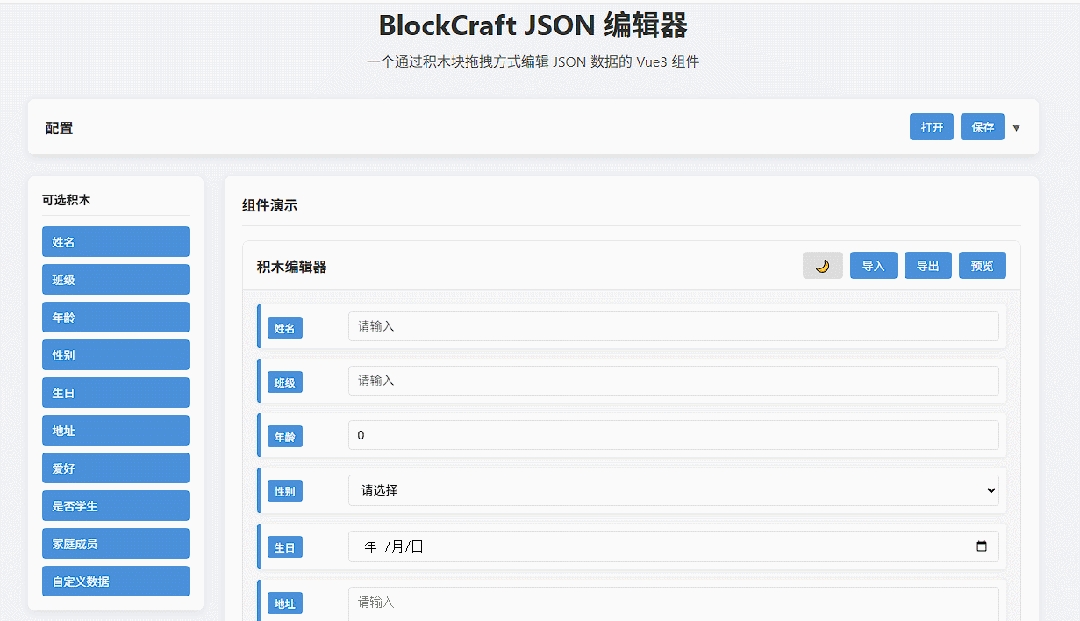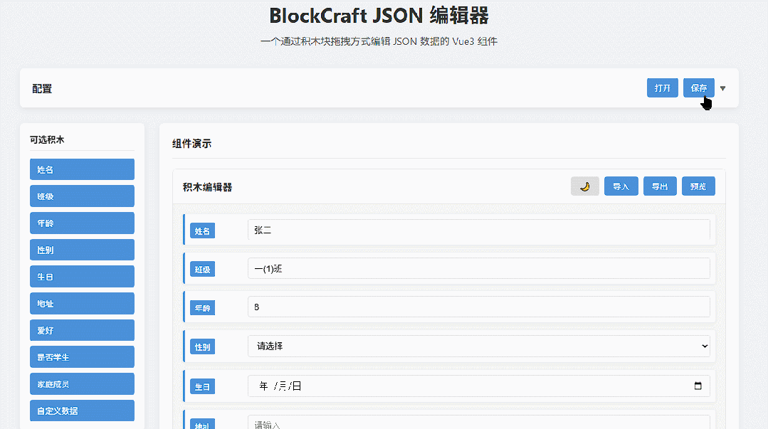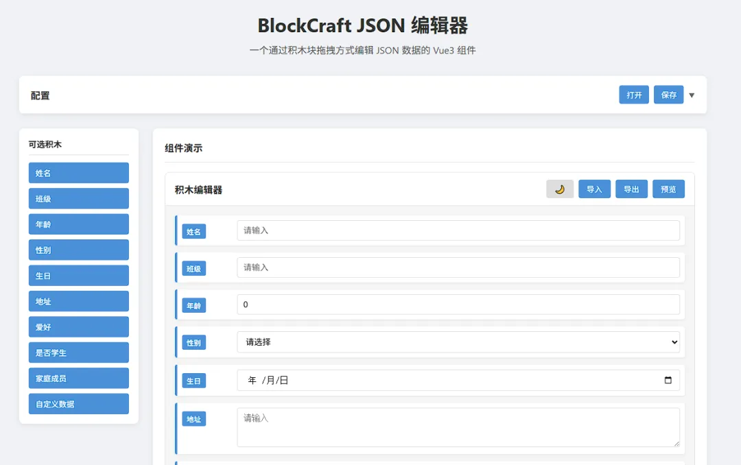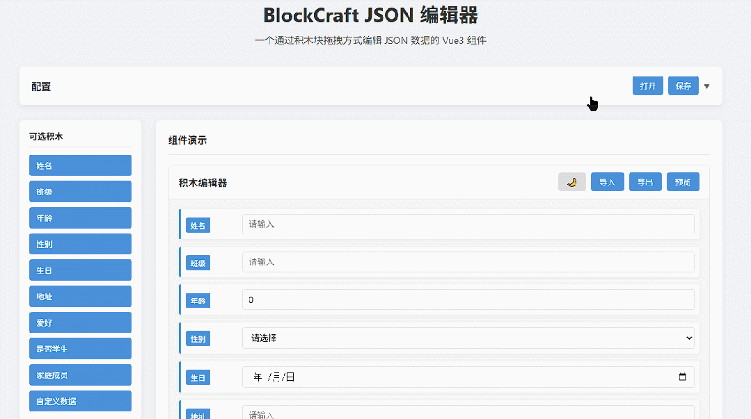 我开发了一个叫BlockCraft JSON的Vue3组件,通过类似Scratch积木块的方式,拖拖拽拽就能编辑JSON数据。先来看看效果: