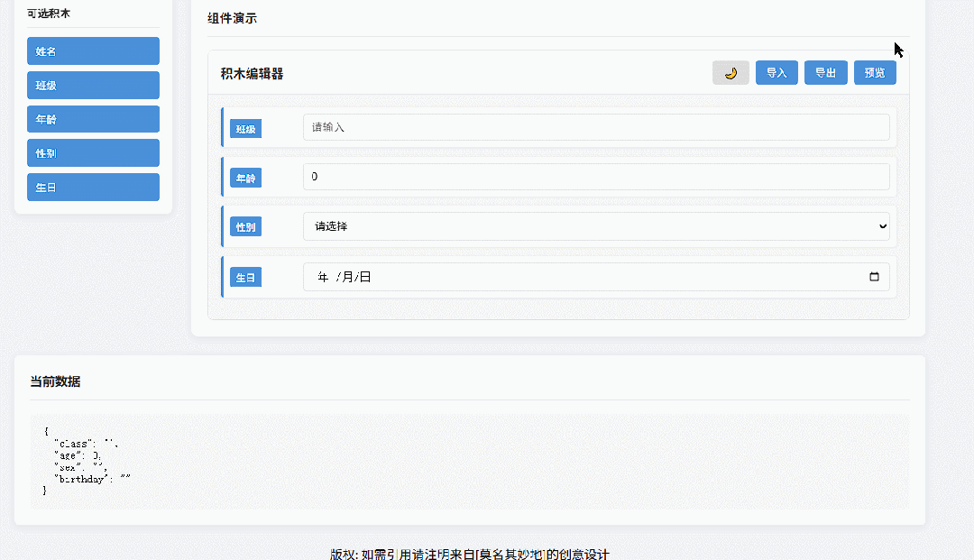 是不是超级简单?拖积木块,实时生成JSON,所见即所得。