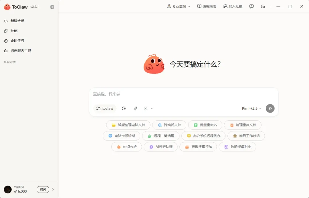 ToClaw目前还在公测阶段,新用户注册可获赠5000积分,每天登录还能额外领取1000积分。