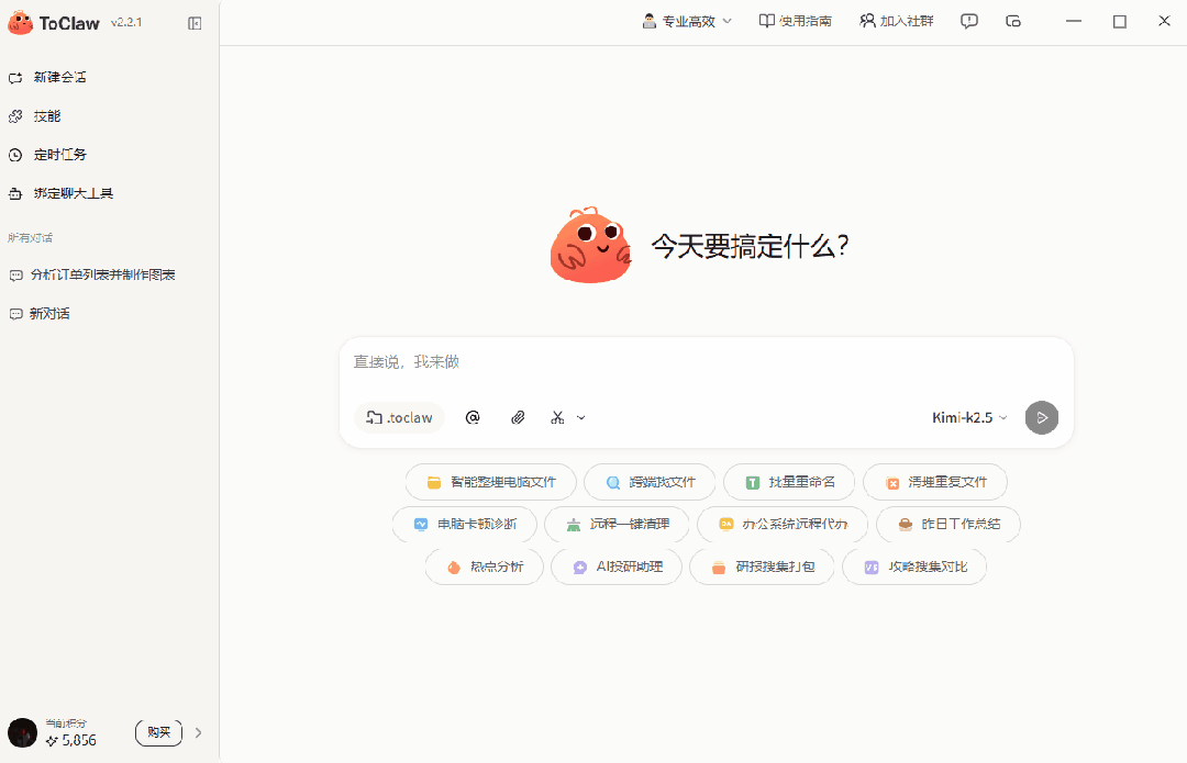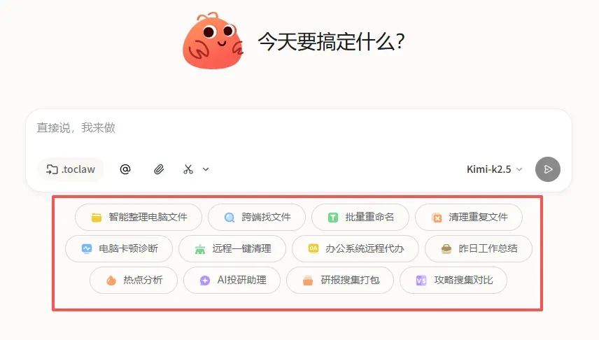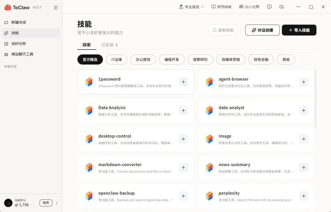 但ToClaw基本就是开箱即用,安装后即可使用,不需要额外折腾。常用技能都已内置,13000+各类技能任你添加,且默认是只需要用大白话下达指令,它就能自动调用相应能力来完成任务。