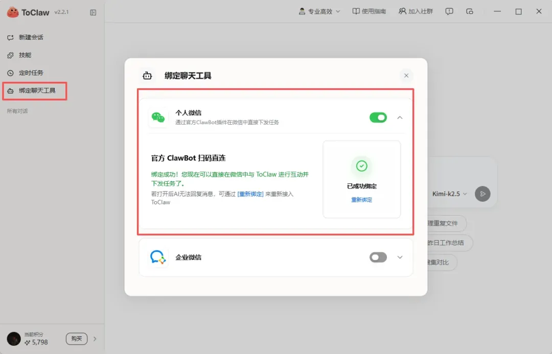 发现连接微信、企微、飞书这些常用工具也都很方便:点开功能、扫个码,就能完成绑定。