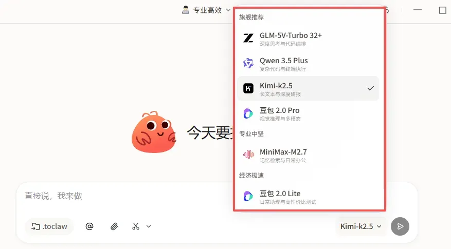 而且你还可以为它设定人设。在界面上方,你可以直接调整ToClaw的风格,比如温柔体贴型,或者川渝暴龙型,具体看个人喜好。