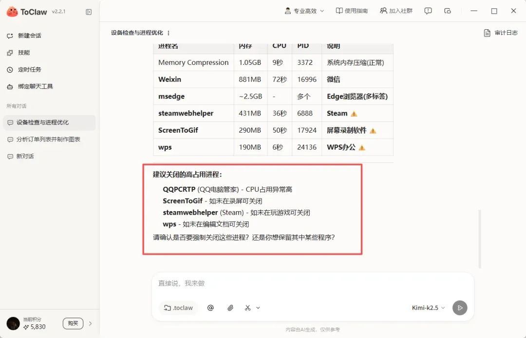 比如,当你觉得电脑有点卡时,可以直接让它帮你做一次简单诊断: