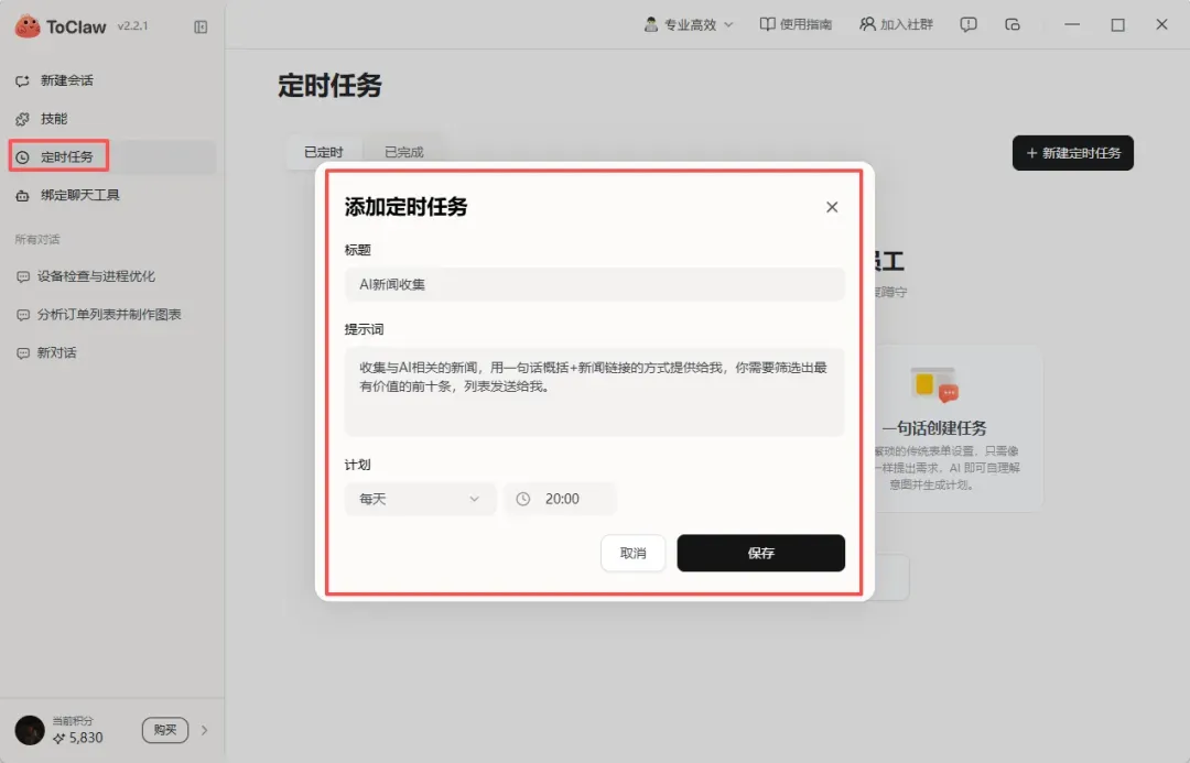 所以,我给ToClaw设定了一个定时任务: