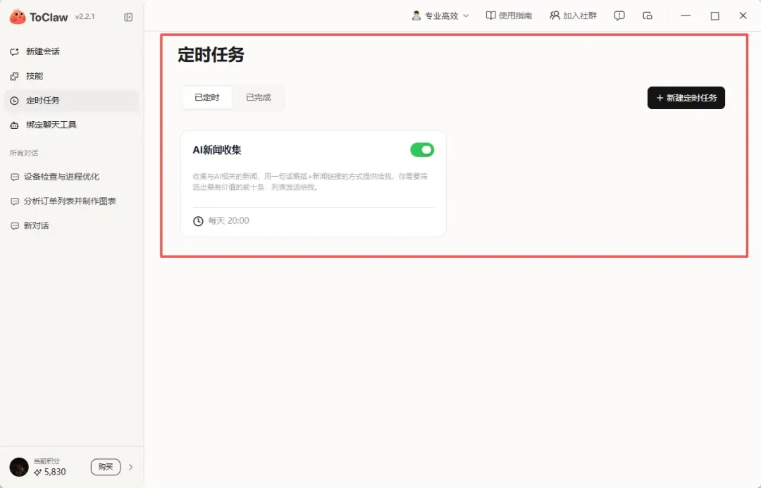ToClaw的定时任务功能有一点做得很好:它提供了专门的管理界面,你可以清晰地看到当前有哪些定时任务正在运行。