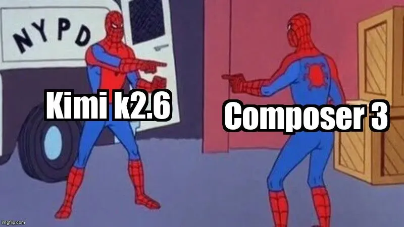这张图本身不是技术论据,但它很适合说明 Kimi K 2.6 在外部产品生态里引发的情绪联想:当一个开源 coding 模型突然把前端、agent、长时执行都抬上来时,大家会自然去联想到 Cursor、Composer、Codex 这类现有产品的压力。