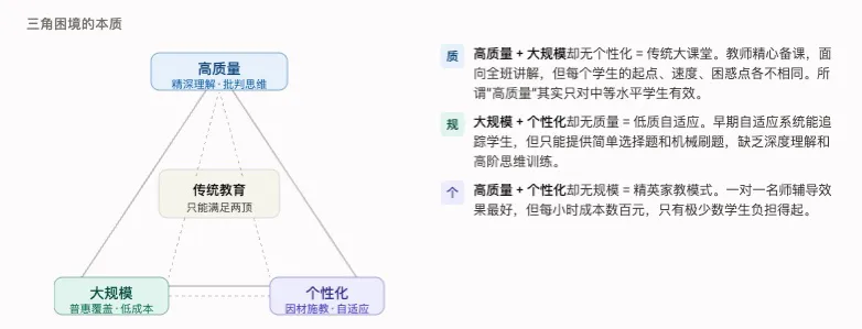 教育界有一个公认的“不可能三角”:高质量、大规模、个性化,三者似乎永远无法同时实现。有人说,AI的出现彻底打破了这个困局,但更诚实的答案是:AI没有“消灭”三角,而是把它从一个固定的零和约束,变成了一个可动态优化、可逐步逼近的工程问题。