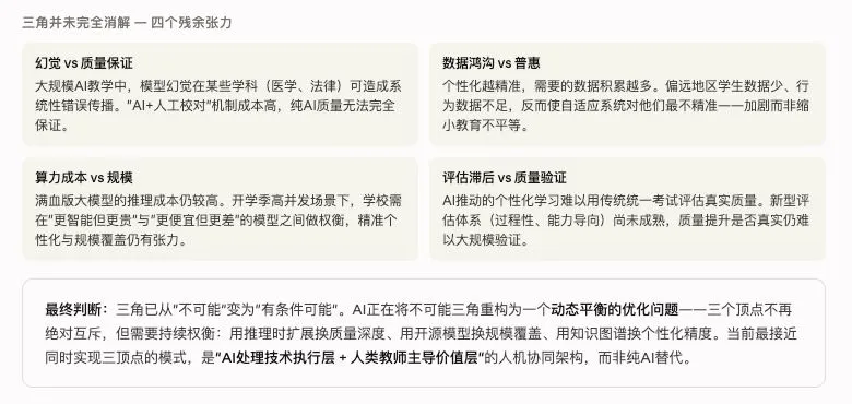 AI没有消灭教育的“不可能三角”,但它给了我们一个破局的机会——它让三角不再是“非此即彼”的零和博弈,而是可动态优化、可逐步逼近的工程问题。