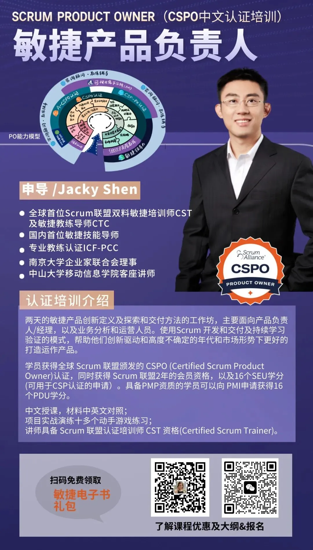 在两天的课程中,学员们将学习 Scrum 的机制及一系列有效的产品策略、工具和实践,领悟如何克服复杂性,及如何在跨职能、自组织的团队中进行充分的互动与协作。学员们将学习如何成为有效的产品负责人,以及如何打造一款用户喜爱的产品。