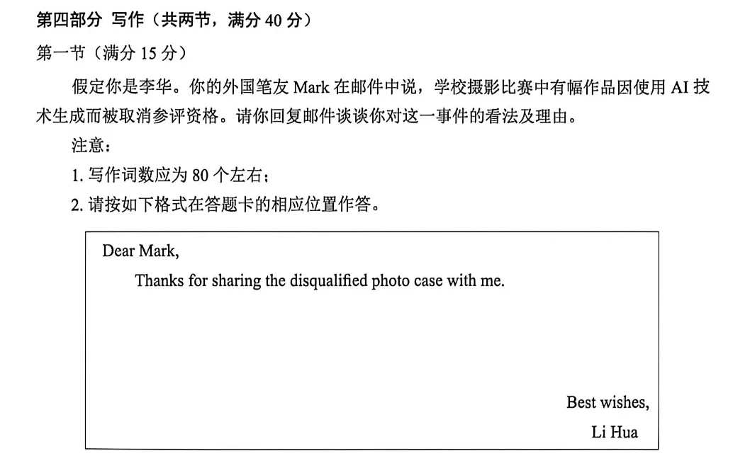 假设你是李华,给 Mark 回邮件。Mark 在邮件中提到:学校摄影比赛中,一位同学因使用 AI 生成作品而被取消参评资格。请你回复邮件,内容包括: