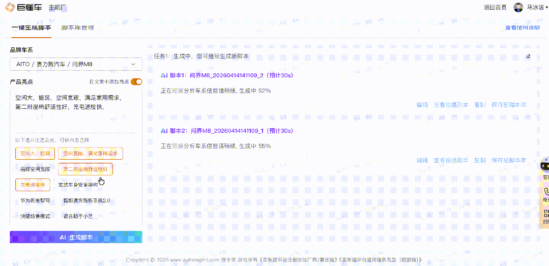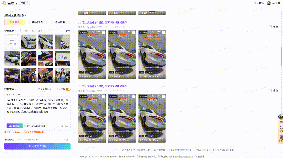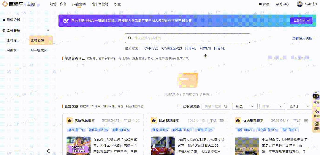 为解决汽车行业从业者在短视频创作过程中的各类难题,懂车云店自主研发多种AI产品工具,助力大家提升短视频制作效率,降低视频制作成本,高效完成广告投放过程中的短视频制作环节。