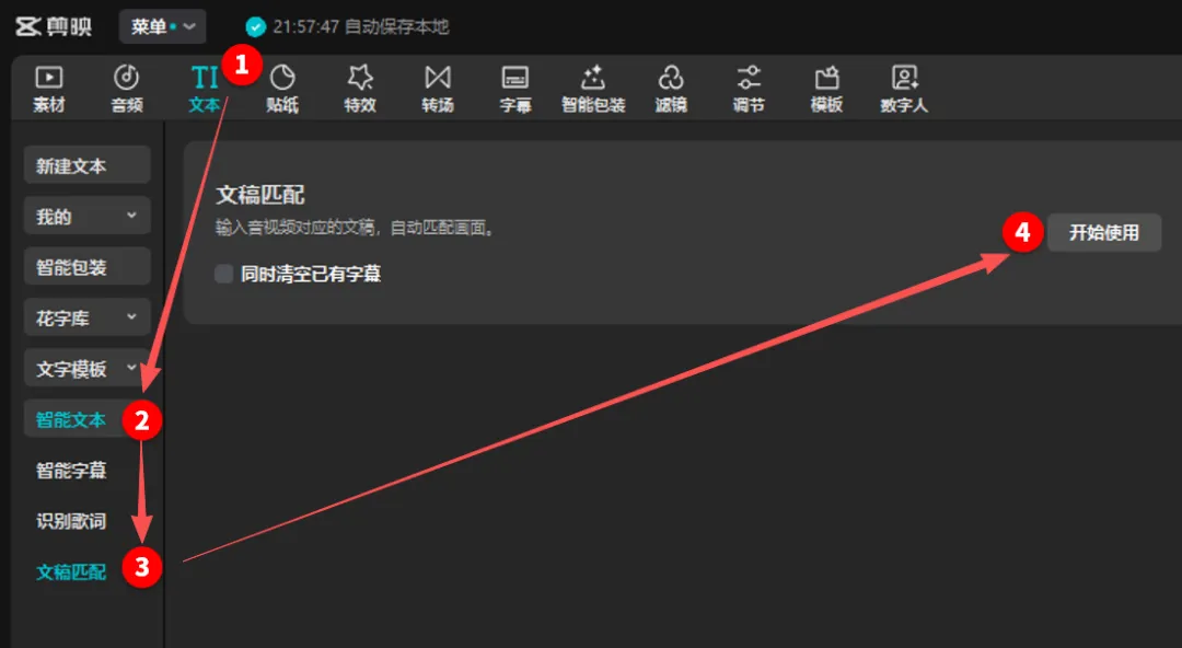 回到剪映,依次打开「文本→智能文本→文稿匹配」功能,粘贴文稿,开始匹配,几秒钟就会自动生成对齐好的字幕。