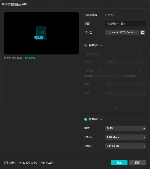 在完成视频的其他剪辑工作后,点击剪映右上角的「导出」按钮,只勾选「音频导出」,选择MP3格式保存到本地。