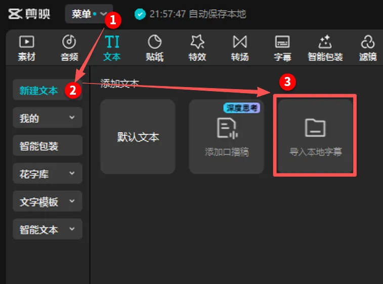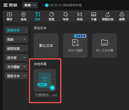 2、回到剪映,依次打开「文本→新建文本→导入本地字幕」,导入刚刚下载到的字幕文件,点击右下角的「+」号即可添加进视频编辑区。