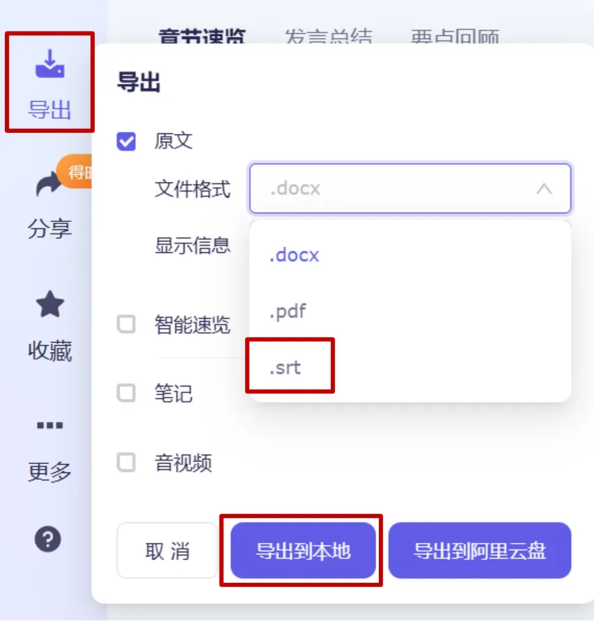 1、通义听悟校对完成后,点击左侧导航栏的「导出」按钮,文件格式选择「.srt」,导出到本地。