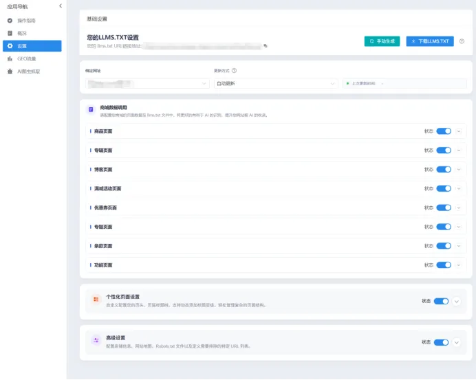 llms.txt 是 AI 识别网站的核心标准文件,相当于 AI 时代的 sitemap.xml,但更智能、更高效。Shopyy 自研 GEO 插件支持全自动生成、自动同步、自动更新 llms.txt,无需手动编写,无需技术操作: