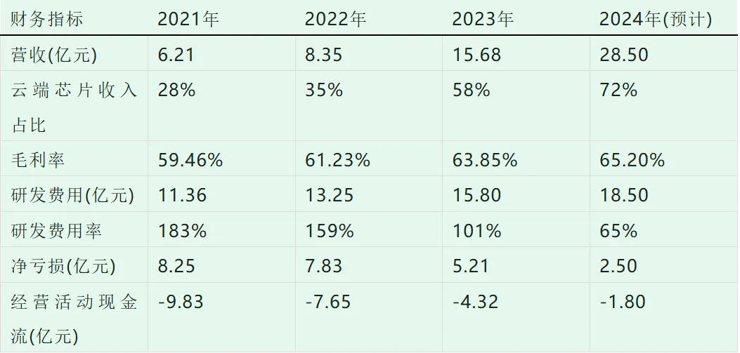 趋势分析: 1. 收入增长加速:从2021年的6.21亿到2024年预计28.5亿,三年增长3.6倍 2. 收入结构优化:云端芯片从次要业务变成主要业务 3. 亏损收窄:净亏损从8.25亿收窄到预计2.5亿 4. 研发效率提升:研发费用率从183%下降到65%
