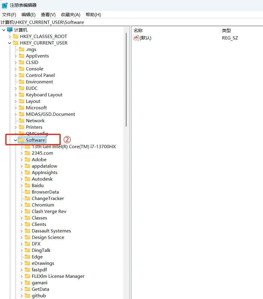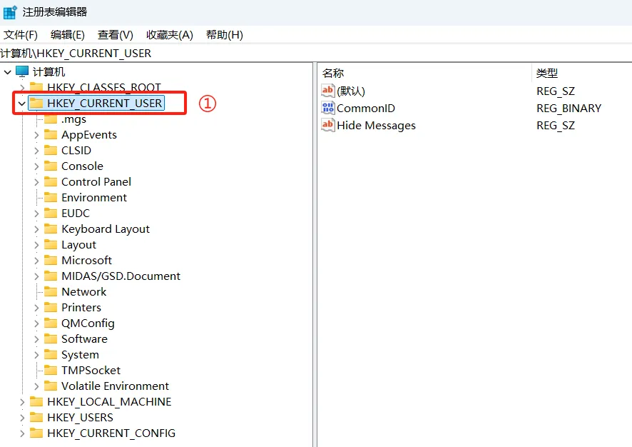 ① 点击左侧菜单栏的【HKEY_CURRENT】文件夹