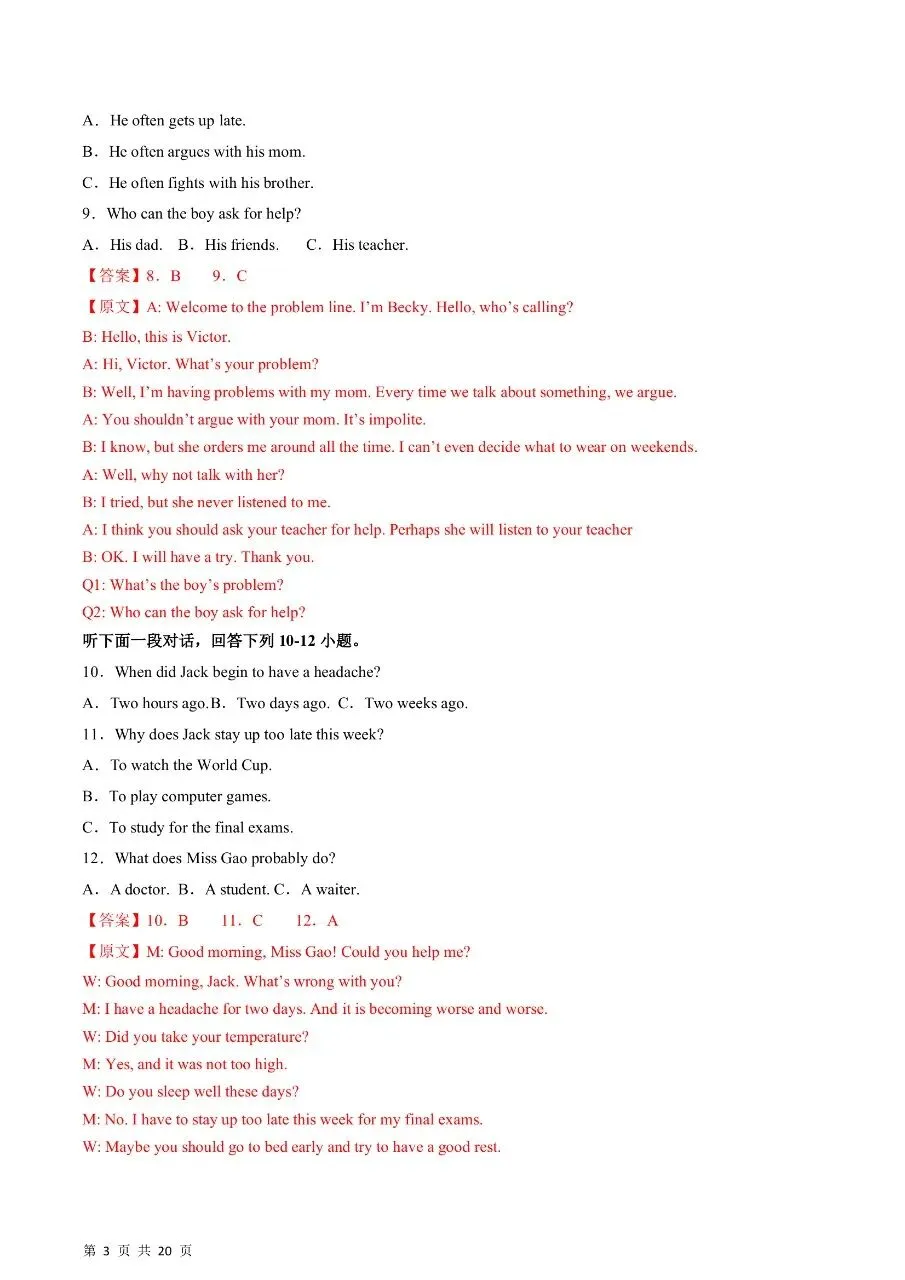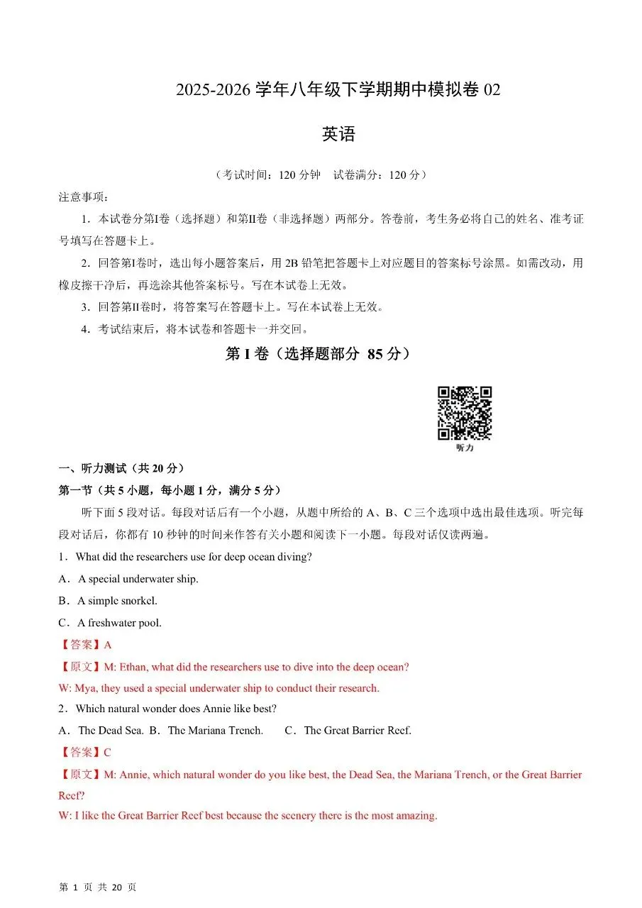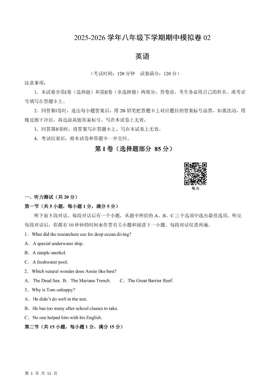 八年级下册英语期中真题卷三套含答案可打印