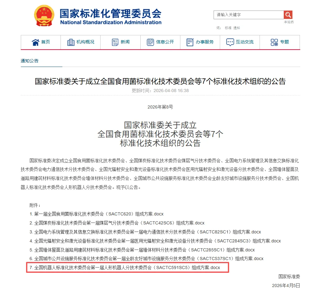 近日,国家标准委公布全国机器人标准化技术委员会第一届人形机器人分技术委员会(SAC/TC591/SC5)组成方案,该委员会主要负责全国人形机器人基础共性、安全与伦理、部组件、整机、应用与集成等领域标准化工作。