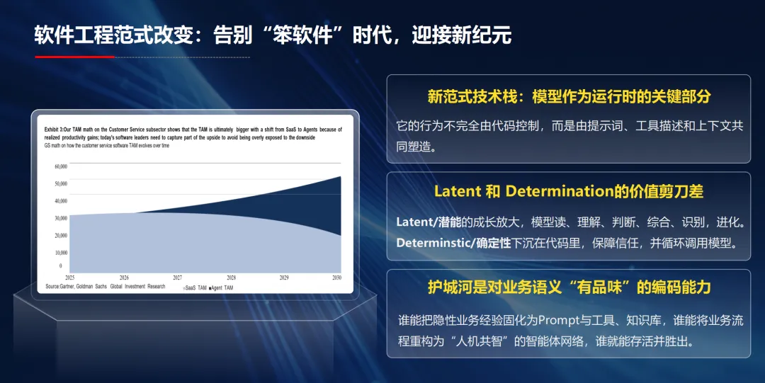 童强在演讲中表示,人工智能正带来软件产业的根本性变革,传统软件工程模式正在被颠覆,行业正告别 “笨软件” 时代,迎来模型驱动的全新发展纪元。他指出,新范式下模型成为软件运行时的关键部分,软件行为不再完全由代码控制,而是由提示词、工具描述和上下文与模型交互共同塑造,形成 “潜能与确定性” 的价值剪刀差。其中,模型负责理解、判断、综合、识别、进化等潜能价值,确定性逻辑下沉到代码中保障信任,并循环调用模型,实现价值持续放大。企业真正的护城河,是对业务语义 “有品味” 的编码能力,能够将隐性业务经验固化为 Prompt、工具与知识库,把业务流程重构为人机共智的智能体网络,才能在新时代存活并胜出。