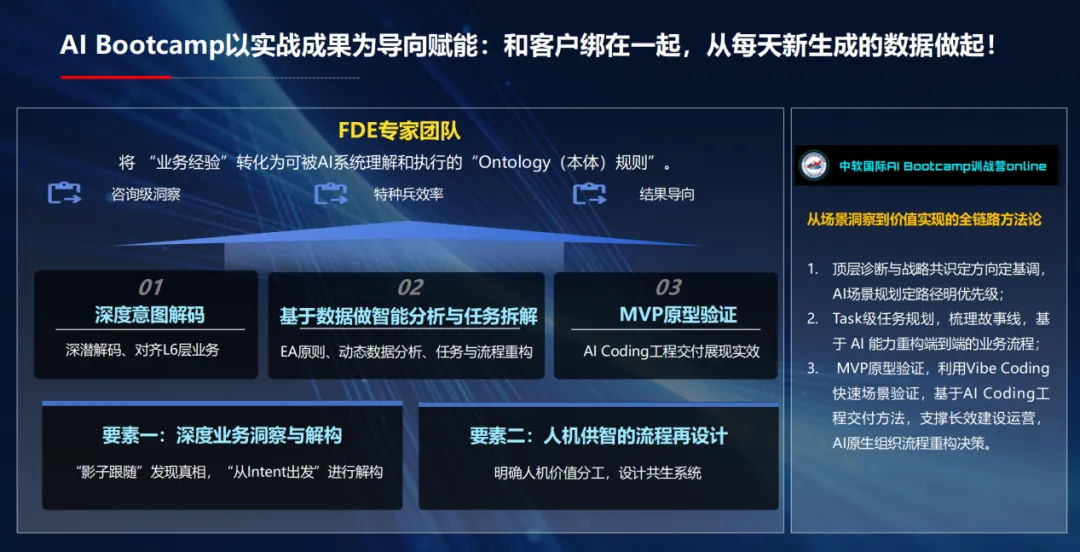 如何将这一愿景落地?中软国际搭建了自己的实战方法论:从顶层诊断与战略共识,到AI场景规划与任务级流程重构,再到MVP原型验证。执行这一方法论的核心力量是FDE专家团队,他们做的最核心的一件事,是把“业务经验”转化为可被AI系统理解和执行的“Ontology规则”。他们能够把业务经验转化为AI可理解执行的本体,深度解码L6层业务逻辑,基于数据做智能分析与任务拆解。中软国际的FDE团队驻扎客户现场,在三周内构建可运行的MVP原型,让客户看到实效后愿意持续投入,最终走向人机共智组织。