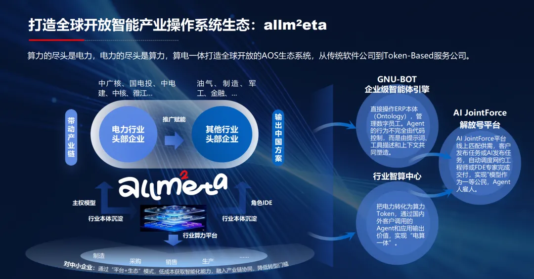 在生态层面,公司践行“电算一体”战略构想,将电力转化为算力 Token,通过智能体与应用输出价值。依托 AI JointForce 平台,实现供需智能匹配与自动调度:面向大型企业,沉淀行业本体与主权模型;面向中小企业,以“平台+生态”模式降低转型门槛,从而推动全产业链智能化升级。公司率先打造并于今年 3 月发布了企业智能操作系统 allmeta,该产品由以 Ecore 为核心的 ERP 系统、电力行业本体层和智能体层三层构成,核心目标是助力传统软件公司实现向 Token-Based 服务公司的跃迁。在电力行业,该方案已落地于某核电央企、国家电投、中电建等头部企业,并逐步向油气、制造、军工、金融等领域推广。童强还描绘了一个更具想象力的未来:AI JointForce 平台将由客户或 AI 自主发布任务,自动调度工程师完成交付。