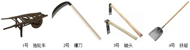 (2)在参观知青主题馆时,大家发现许多知青当年使用过的农具,请你仿照小橙为1号农具写的介绍语,说说另外几种农具的特点和功能。(从2——4号图片中任选一种)