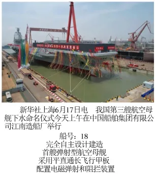 2019年12月17日,山东舰入列,辽宁舰有了“兄弟”,不再孤单;2022年6月17日,我国第三艘航母福建舰下水命名,该舰是我国完全自主设计建造的首艘弹射型航空母舰,采用平直通长飞行甲板,配置电磁弹射和阻拦装置,满载排水量8万余吨。