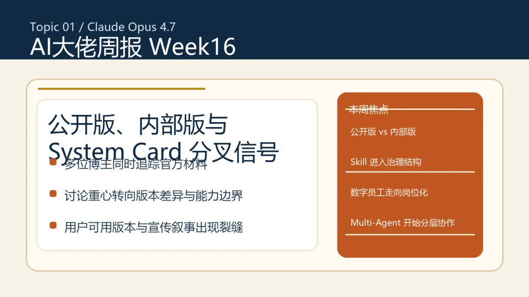 | Claude / Anthropic | 上周还在讨论 Agent 平台化与托管执行 | 本周集中转向 Opus 4.7、System Card、公开版与内部版差异 | 一手材料开始直接进入中文博主讨论主线 |
