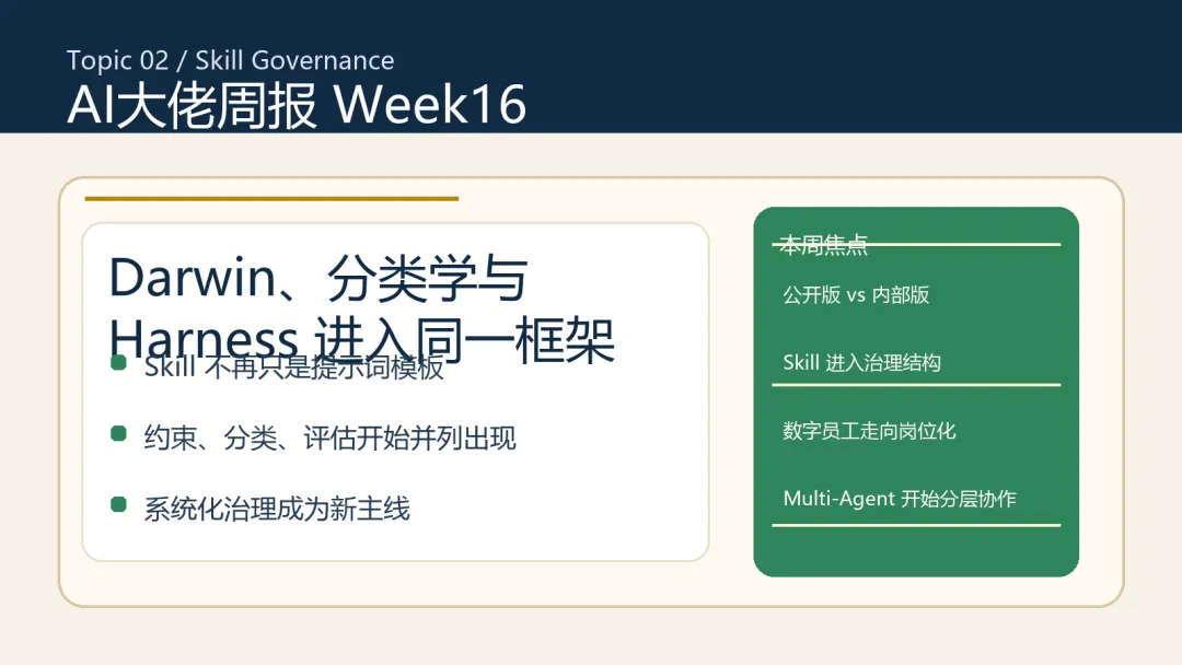 | Skill | 上周重点是蒸馏、资产化、方法沉淀 | 本周继续推进到 Darwin、Harness、分类学与治理结构 | Skill 开始从单点技巧走向体系化治理 |