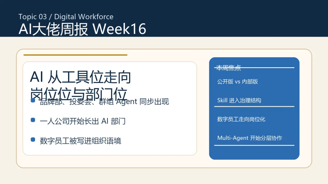 | 数字员工 | 上周主要是个体工作流与单人提效 | 本周开始出现品牌部、投委会、群组 Agent、AI 当“人”用 | AI 位置从工具位向岗位位、部门位移动 |