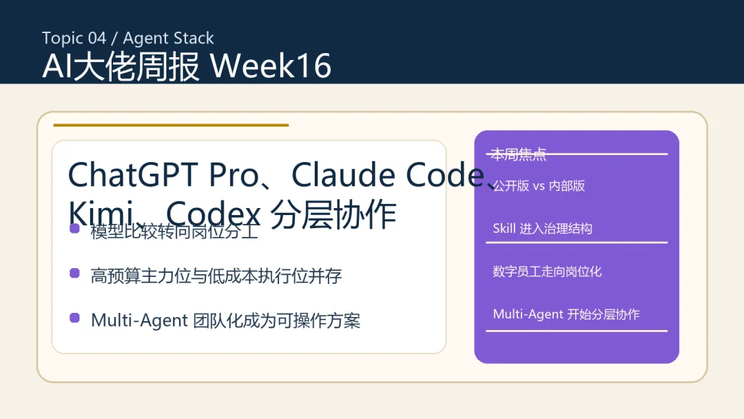| 编程工作流 | 上周仍以 Claude Code、Agent 化为主 | 本周开始出现 ChatGPT Pro、Kimi K2.6、Codex、多 Agent 团队协作的分层搭配 | 模型比较开始转向任务分工与成本结构 |