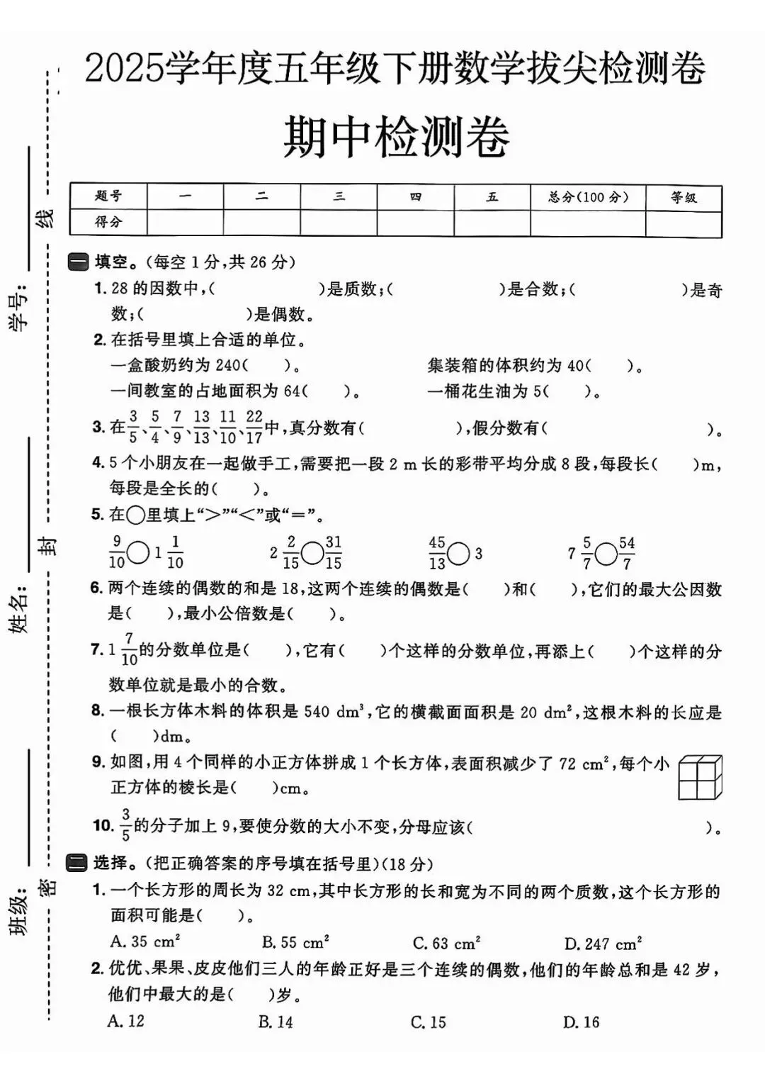 5套押题卷均围绕期中前核心考点设计,全面覆盖:因数与倍数、长方体和正方体的认识及表面积、分数的意义和性质、分数加减法(基础)四大单元,精准押中期中高频考点、易错点与重难点。每套试卷题型规范,包含填空、判断、选择、计算、操作、解决问题六大题型,难度由基础到提升阶梯分布,既注重基础题巩固,也侧重拔高题训练,贴合校内期中考试难度与命题思路。