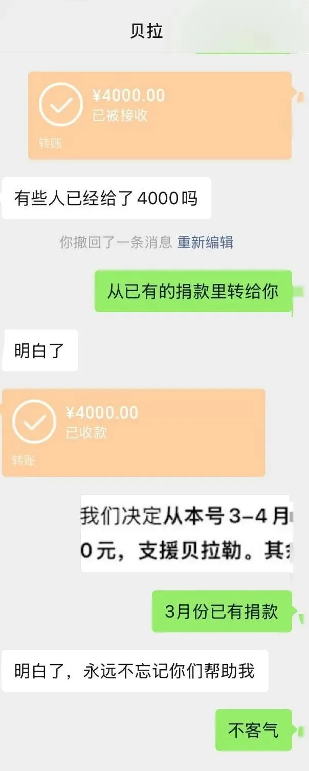 我们已从所获赞赏中提取4000元,转给了贝拉勒,他对我们表示了感谢: