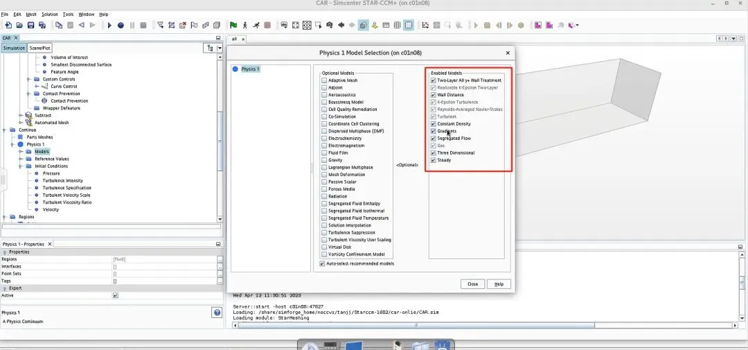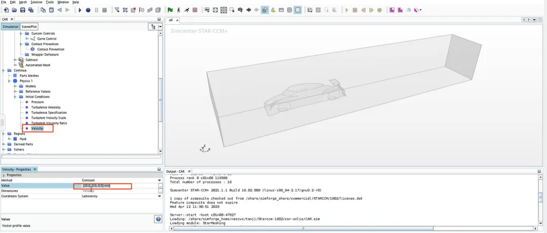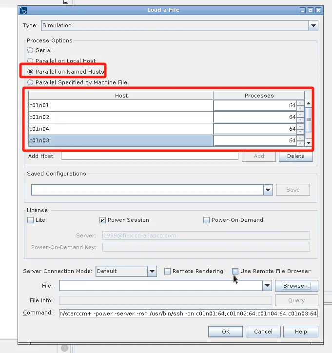 提交后点击图形界面按钮进入STAR CCM+软件界面-载入工程文件,可以看到实际作业是运行在如下的4个节点上,运行规模与作业提交时一致,选择sim文件,进入设置界面。