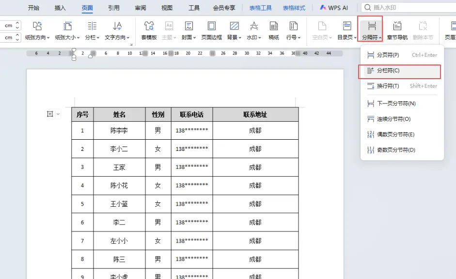 光标定位第一个单元格,选择页面里的分隔符-点击分栏符