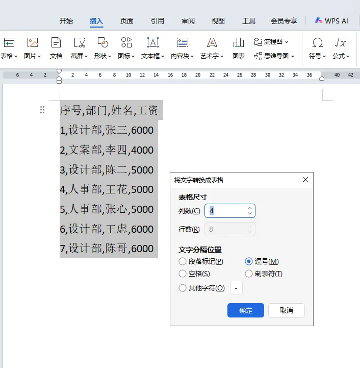首先按ctrl+a全选,点击插入里的表格,选择文本转换成表格,因为是用逗号隔开的,所以文字分隔位置,我们要选中逗号(记住逗号一定要是英文版式的),再点击确定就可以了