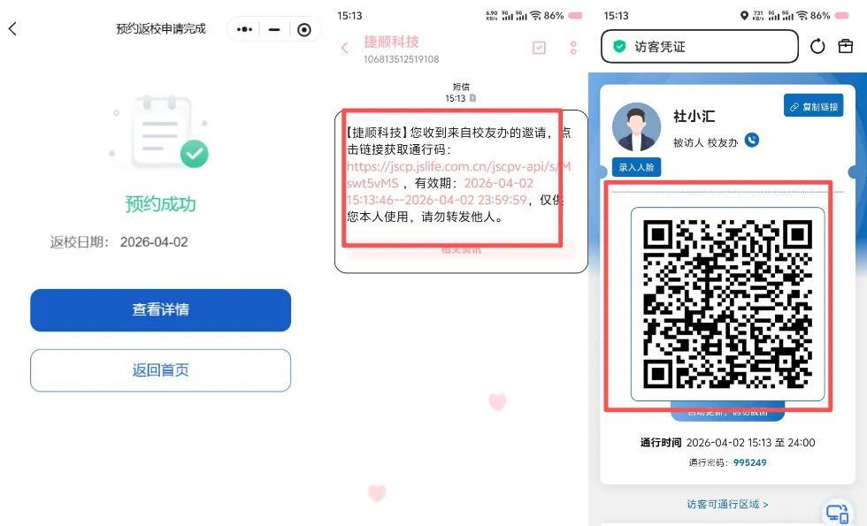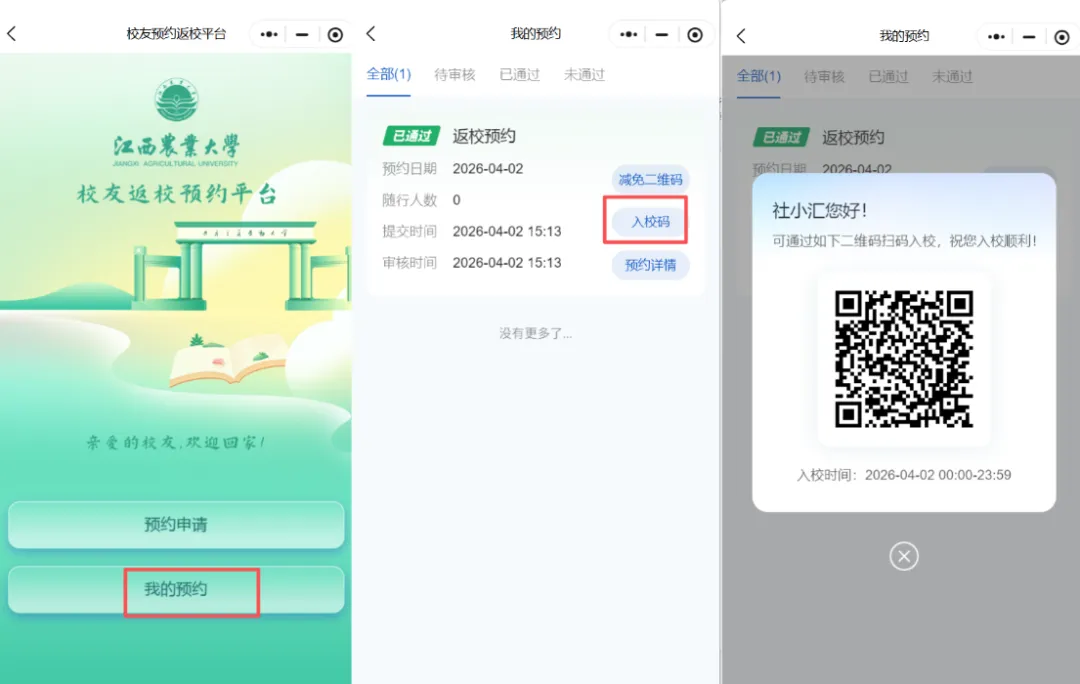 在“江农校友”微信小程序中预约成功后,会收到短信,入校时可打开短信链接中的二维码或者小程序中的入校二维码,扫码入校。