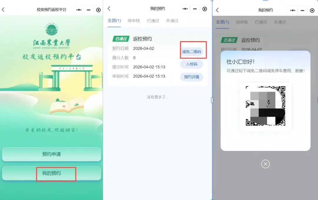 已进行“江农校友”认证注册过的成员,在使用微信小程序预约时,系统会以校友身份自动审核通过,在门卫处通过扫码入校;