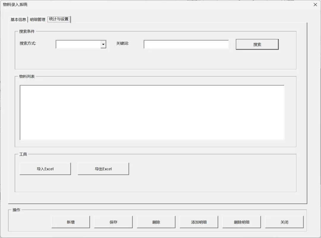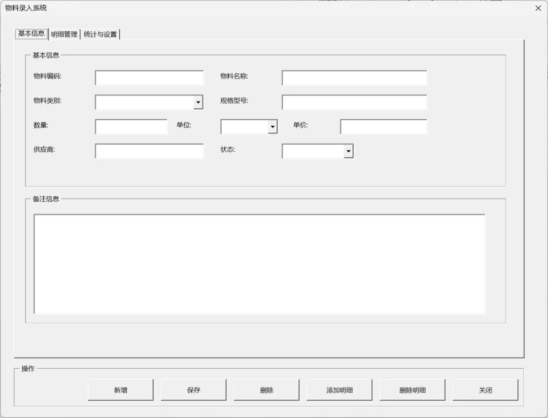 请帮我生成一个物料管理系统窗体,使用多页和Frame进行布局,需要有必要的基础功能,功能区分明,简洁易操作