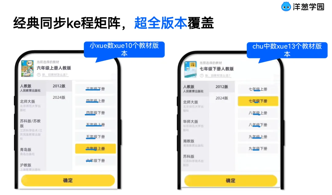 洋葱学园的课程是支持不同地区的教材版本的,数学、语文、英语、物理、化学、生物、地理、历史……小初高全科都有。不用几个APP来回切,一个洋葱就够了!