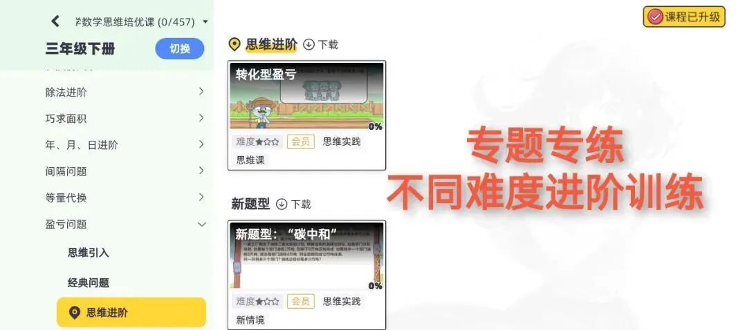 2)用“思维培优”板块,学一个拓展专题,比如重点“间隔问题”、“盈亏问题”,专门对付考试的附加题以及小奥的拔高题。