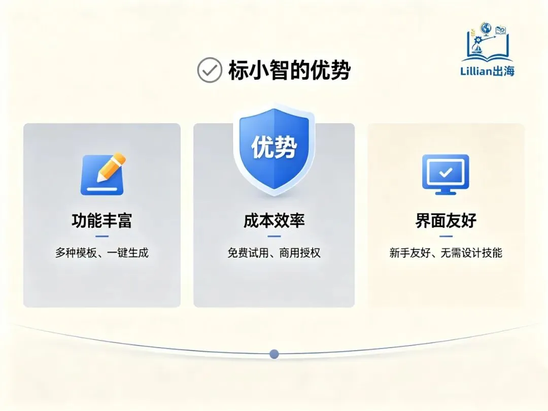 💡 小技巧:做外贸最怕版权纠纷。标小智提供商用授权,这点非常重要!用在自己的产品包装、网站、名片上,不用担心被告侵权。