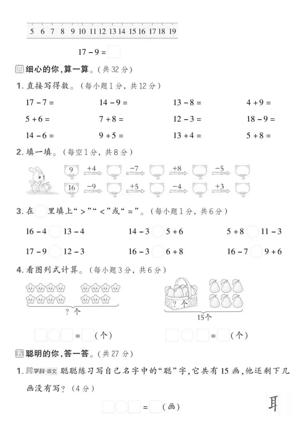 内容严格对应北师大版一年级下册期中前核心考点,覆盖:20 以内退位减法、100 以内数的认识、比较大小、图形的认识、人民币认识、分类与整理、简单解决问题等期中必考内容。每套试卷均包含填空、选择、判断、计算、看图列式、解决问题等完整考试题型,难度适中,侧重基础巩固与易错点训练,精准押题期中高频考点。