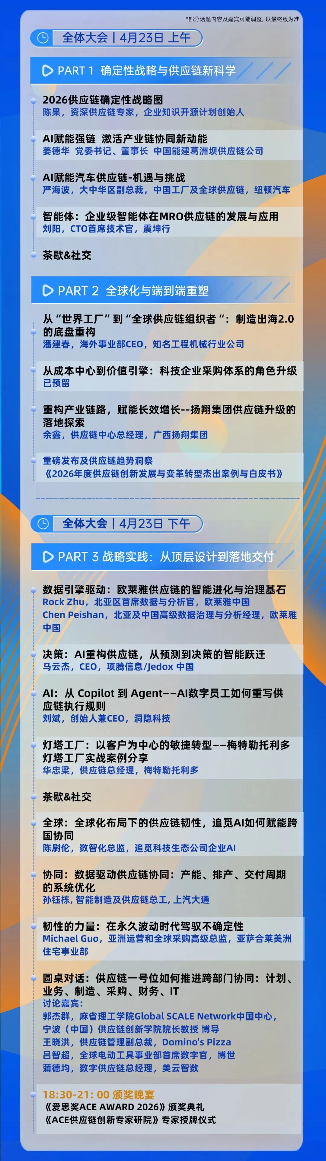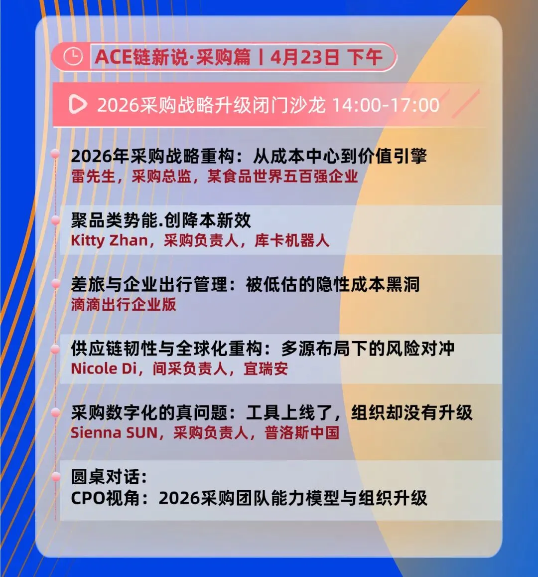 ACE2026全体大会(4月23日,全天)将会有来自中国能建葛洲坝供应链公司党委书记兼董事长姜德华先生、三一重工海外事业部CEO潘建春先生、欧莱雅北亚区首席数据与分析官Rock Zhu先生等近20位重磅级演讲嘉宾,聚焦供应链发展趋势、战略路线图、全球化与出海、重构、AI与智能体、数据治理与韧性体系等最前沿热点的洞察、策略与实践。