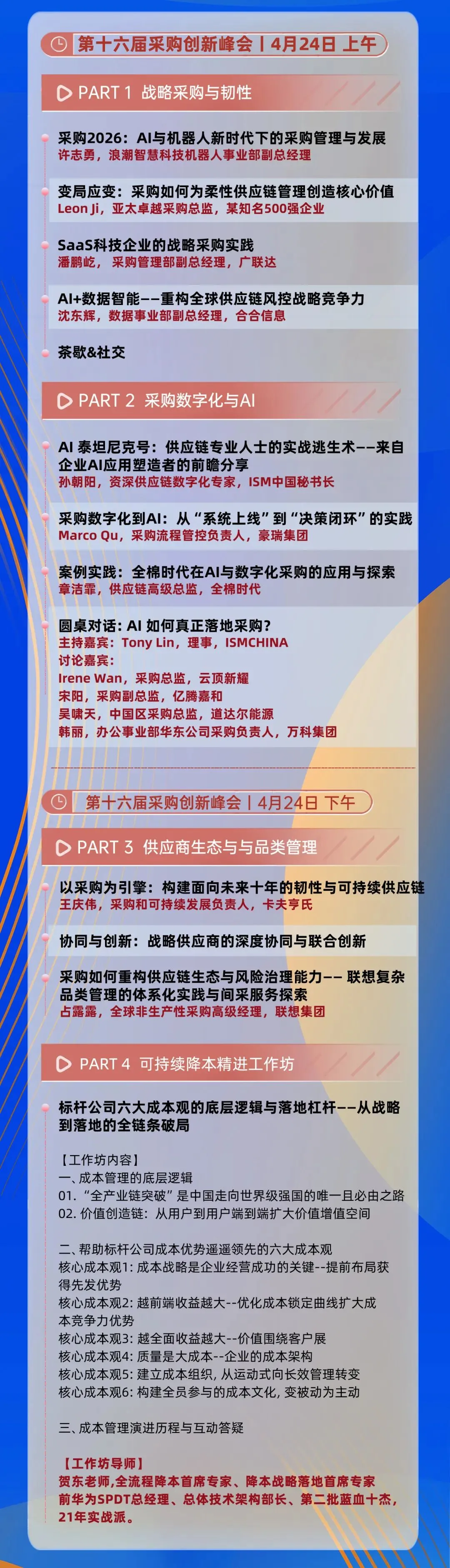 4月24日,采购创新峰会将聚焦战略采购与韧性、采购数字化与AI落地、供应商生态与品类管理、可持续降本四大核心板块,汇聚浪潮智慧科技终端机器人事业部副总经理许志勇、某知名500强企业亚太卓越采购总监Leon Ji,豪瑞集团流程管控负责人Marco Qu、广联达科技采购管理部副总经理潘鹏屹、全棉时代供应链高级总监章洁霏、联想集团全球非生产性采购高级经理占露露、卡夫亨氏采购与可持续发展负责人王庆伟、ISM中国秘书长孙朝阳、合合信息数据事业部副总经理沈东辉等众多世界500强及行业标杆企业的资深专家带来前沿实战分享。